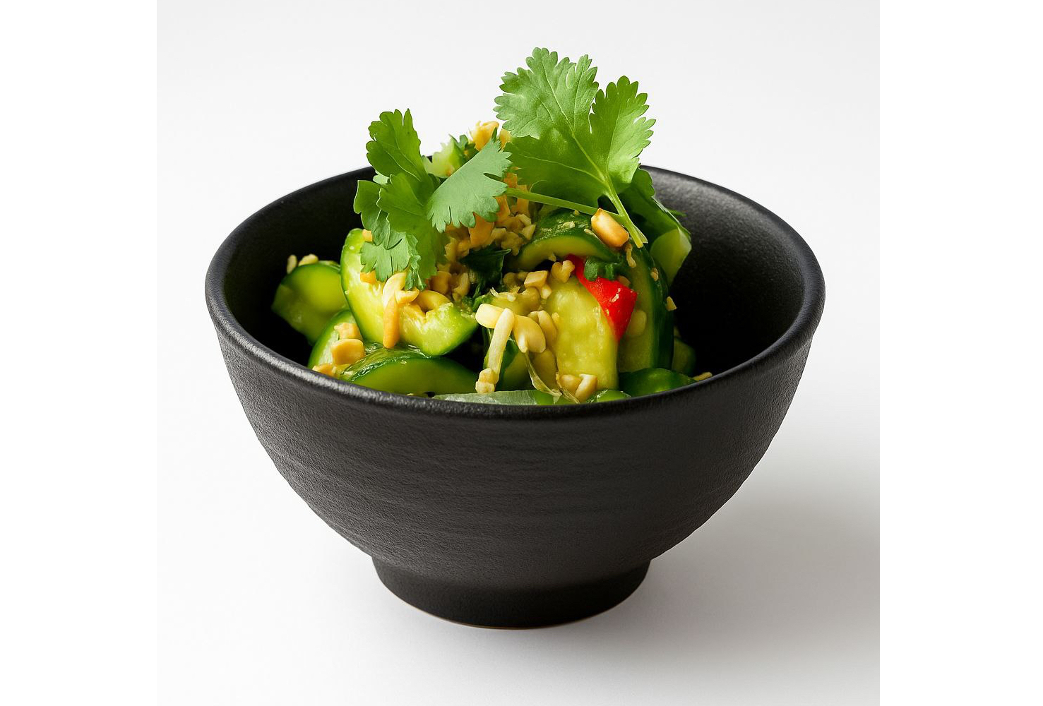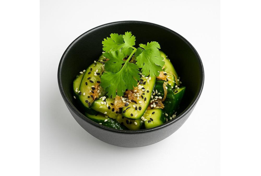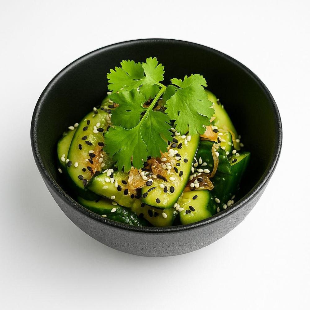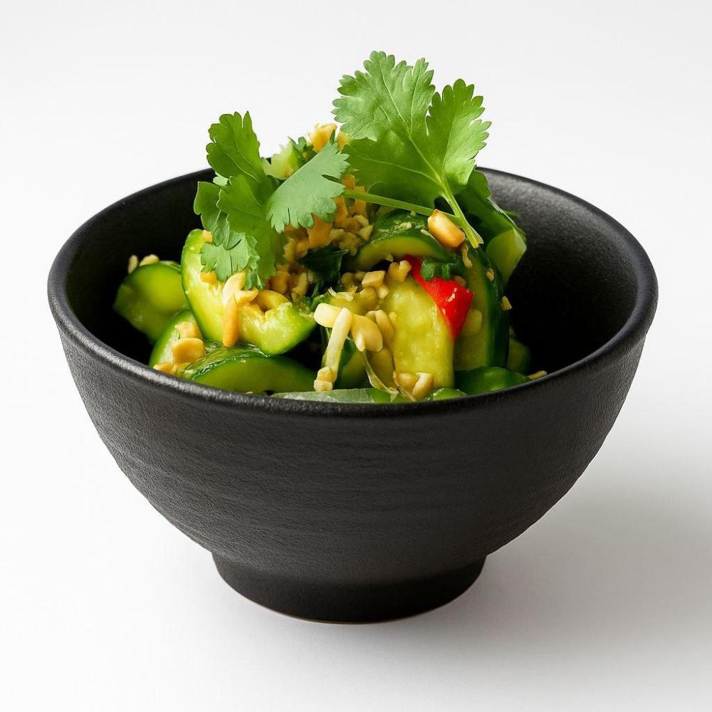 Огурцы, перец чили, кинза, имбирь, уксус рисовый, рыбный соус, кунжутное масло, соевый соус, кунжут, кешью, зелёный лук