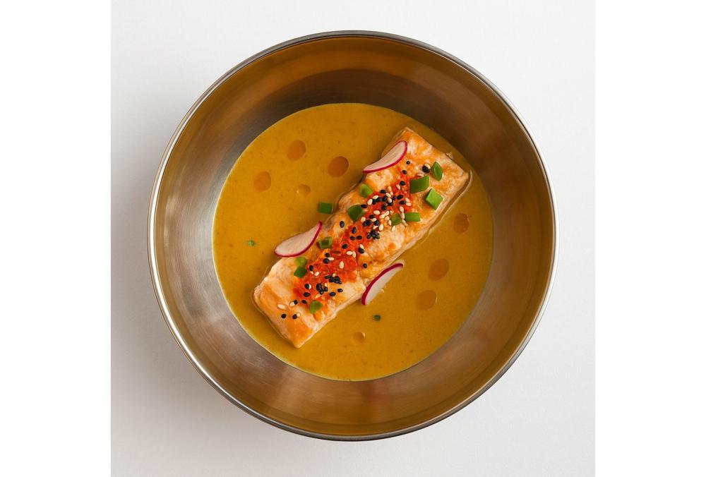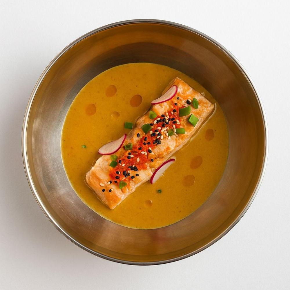 Лосось, соус тайский, редис, икра тобико, лук сибулет , лайм, чили, зелёное и красное масло