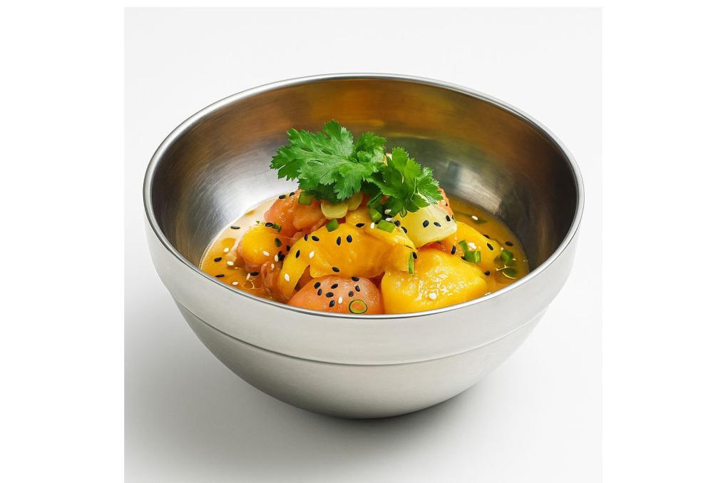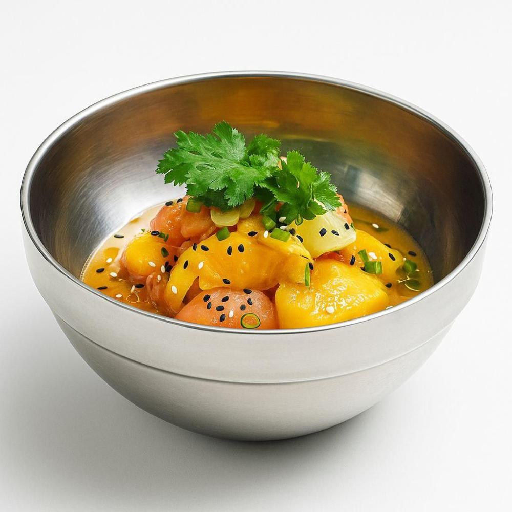 Лосось, манго, лук красный, чили, кинза, лайм, апельсин, лук сибулет
