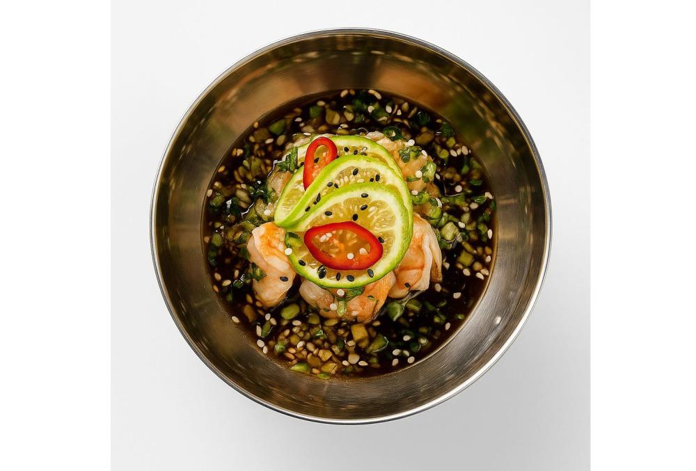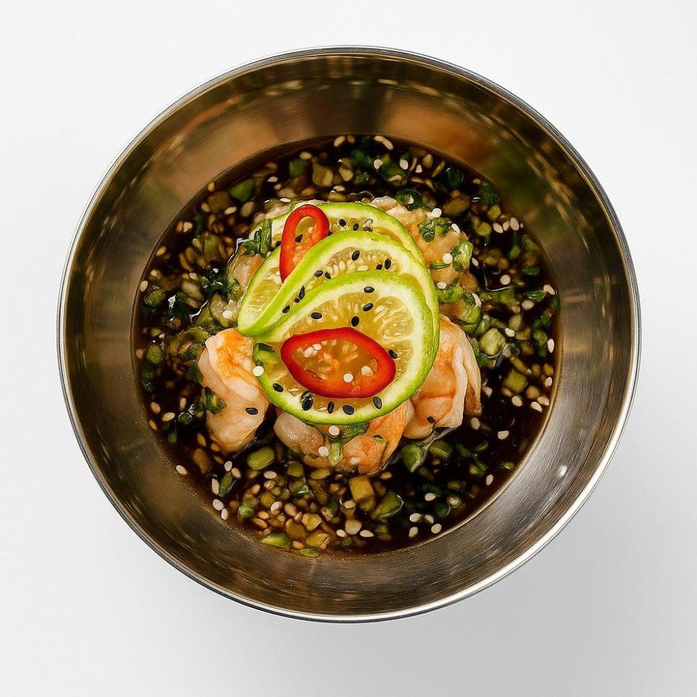 Креветки тигровые, соус понзу ,кумкват, огурцы, кинза, кунжут, Черри, лайм, лук сибулет